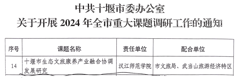 近日,十堰市委办公室下发了《关于开展2024年全市重大课题调研工作的通知》,威廉体育williamhill副经理廖兆光主持的《十堰市生态文旅康养产业融合协调发展研究》成功立项。