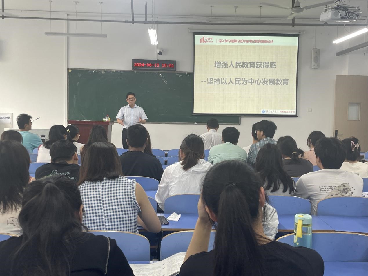 王处长从习近平总书记“培养什么人、怎样培养人、为谁培养人”这一根本问题为同学们作了详细讲解,指出要坚持以人民为中心发展教育。推进我国教育改革发展要做到“九个坚持”:坚持党对教育事业的全面领导、坚持把立德树人做为根本任务、坚持优先发展教育事业、坚持社会主义办学方向、坚持扎根中国大地办教育、坚持以人民为中心发展教育、坚持深化教育改革创新、坚持把服务中华民族伟大复兴作为教育的重要使命、坚持把教师队伍建设作为基础工作。“九个坚持”是习近平总书记关于教育的重要论述科学内涵的高度概括。