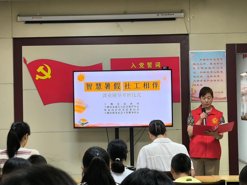 本次社会实践活动得到了十堰市民政局和十堰市未成年人社会保障中心的大力支持,由“星未来”实践团、韩家沟社区、十堰市阳光社会服务中心联合承办。7月8日开班仪式上,十堰市阳光社会工作服务中心的负责人王芳对各位莅临指导的领导以及社会实践的志愿者表示热烈欢迎,表达了对本次活动的美好祝愿和期望;志愿者代表和社区员工代表也在仪式上展示了自己对本次活动的热情和支持。现场气氛热烈,掌声不断回响。