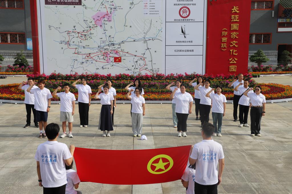 早上7:30联合研学实践队从威廉希尔williamhill出发,首先到达郧西县关坊乡丁家坪村红二十五军223团政治部旧址进行参观,聆听了一张传单——什么是红军的生动故事。下午,团队到达郧西县上津古镇,深入了解湖北解放第一县的历史背景和革命故事。随后,全体成员在郧西县城关镇王家坪村鄂豫陕革命根据地纪念馆重温入团誓词,为革命烈士纪念碑献上鲜花,并参观了纪念馆,进一步了解了鄂豫陕革命根据地的光辉历史。