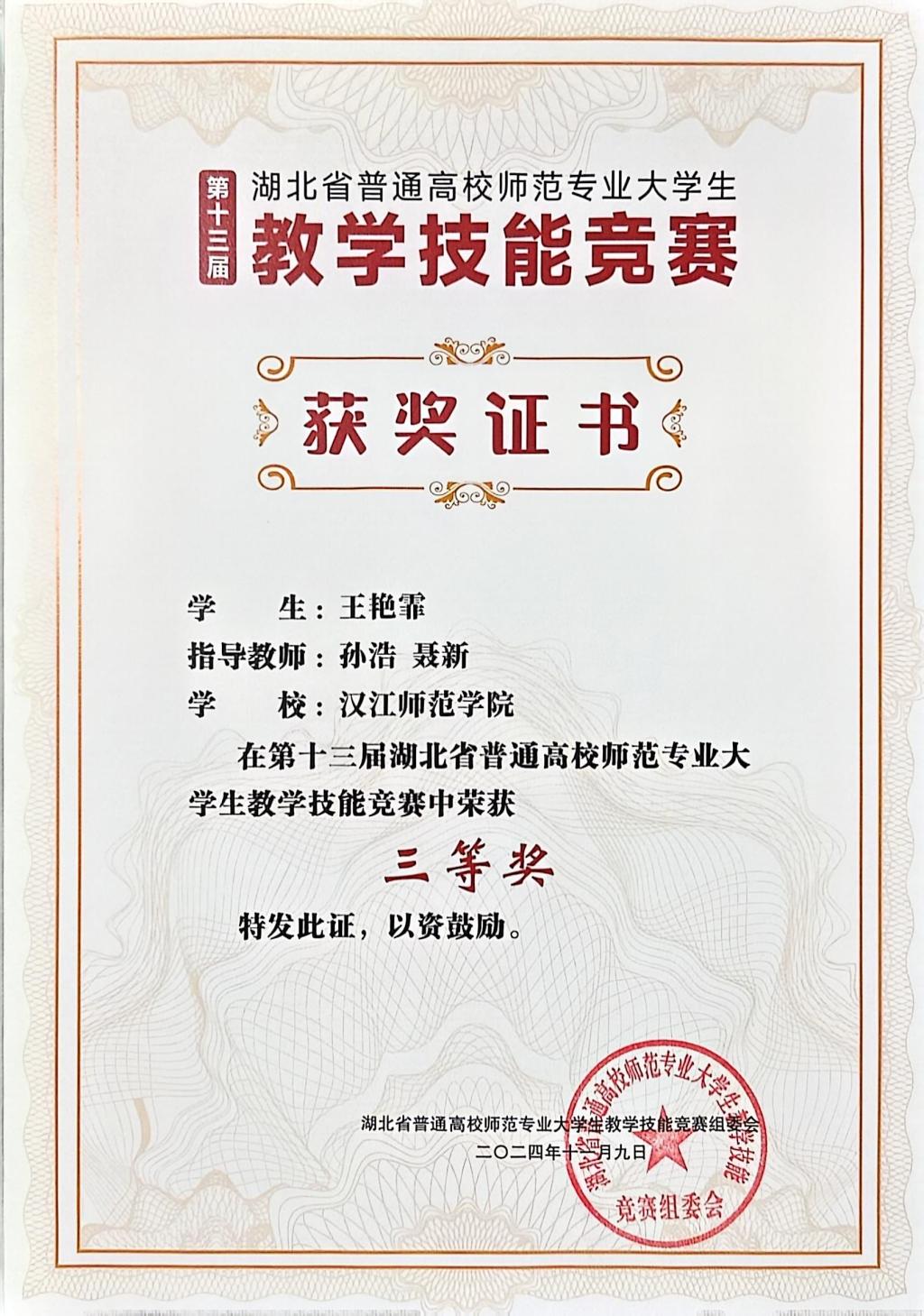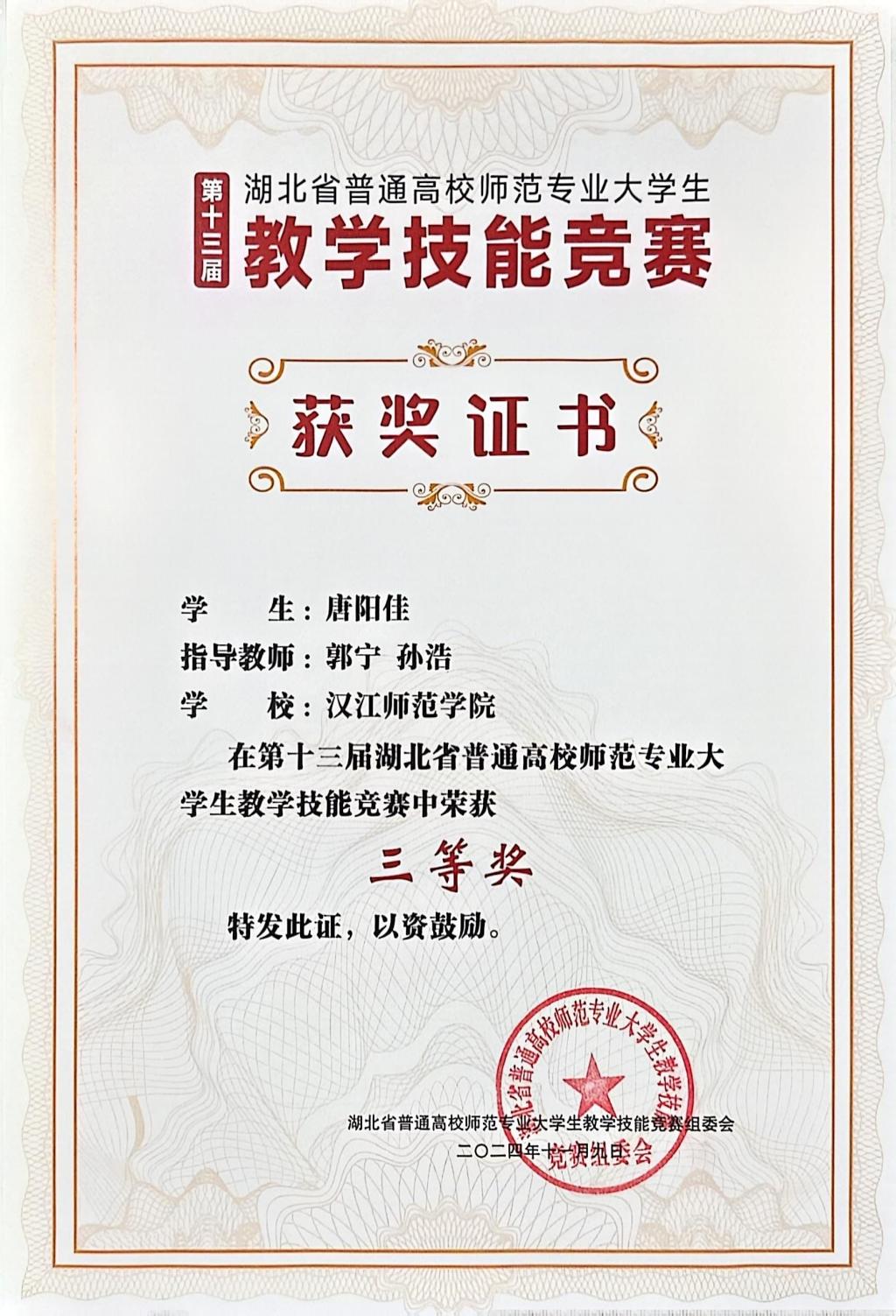 近日,第十三届湖北省普通高校师范专业老员工教学技能竞赛在华中师范大学圆满落下帷幕,公司历史学专业的唐阳佳和王艳霏同学在孙浩、郭宁和聂新老师,以及十堰市郧阳中学的李卫老师、东风第七中学的李吉老师的共同指导下,分别荣获初中历史组和高中历史组 “三等奖”的佳绩。