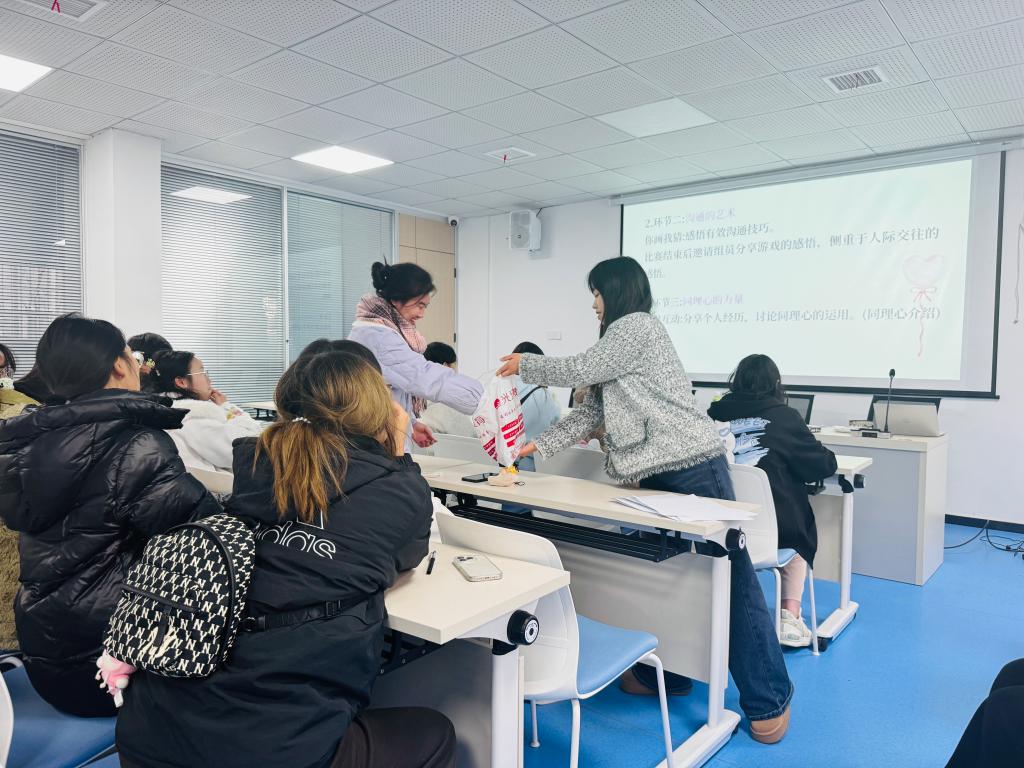 活动分为游戏互动与讨论总结两大环节。在“认识你我——击鼓传花”游戏中,同学们伴着音乐传递小零食,音乐停时,接到零食的同学需接受“真心话大冒险”挑战。这一环节让不同班级的同学们在紧张而有趣的互动中逐渐拉近距离,现场气氛热烈。随后的“你画我猜”游戏,则通过肢体语言展现了多样化的沟通技巧,参与的同学表示,这既考验了想象力,又检验了彼此间的默契与配合,同时通过游戏意识到沟通在人际交往中的重要性。小组讨论环节聚焦“同理心”议题,心理委员朱碧玉向大家详细解释了同理心的含义,并鼓励大家学会换位思考,以同理心去理解他人,关心需要帮助的同学。