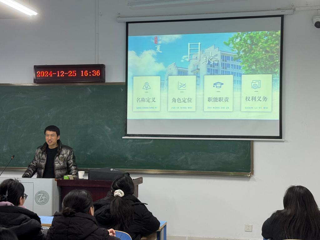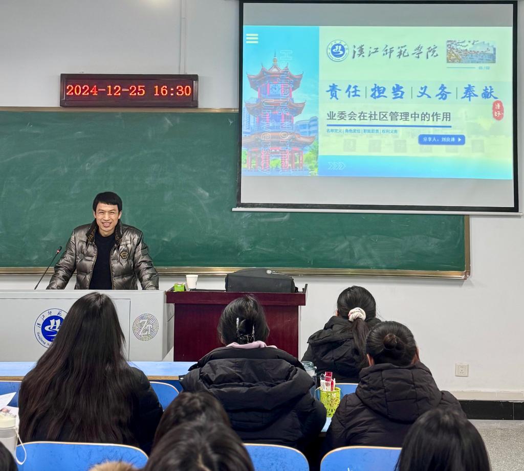 在探索地方应用型高校实践型和“新质人才”培养路上,威廉体育williamhill行政管理专业积极探索,不断前行。12 月 25 日晚,十堰市高校园社区业委会主任刘良涛踏入行政管理 2201 班《社区管理学》实训课堂,以 “业委会在社区治理中的角色和作用” 为主题,为同学们带来一堂严谨且实用的社区治理实践课,在校园与社区之间搭建起一座知识交流的桥梁。