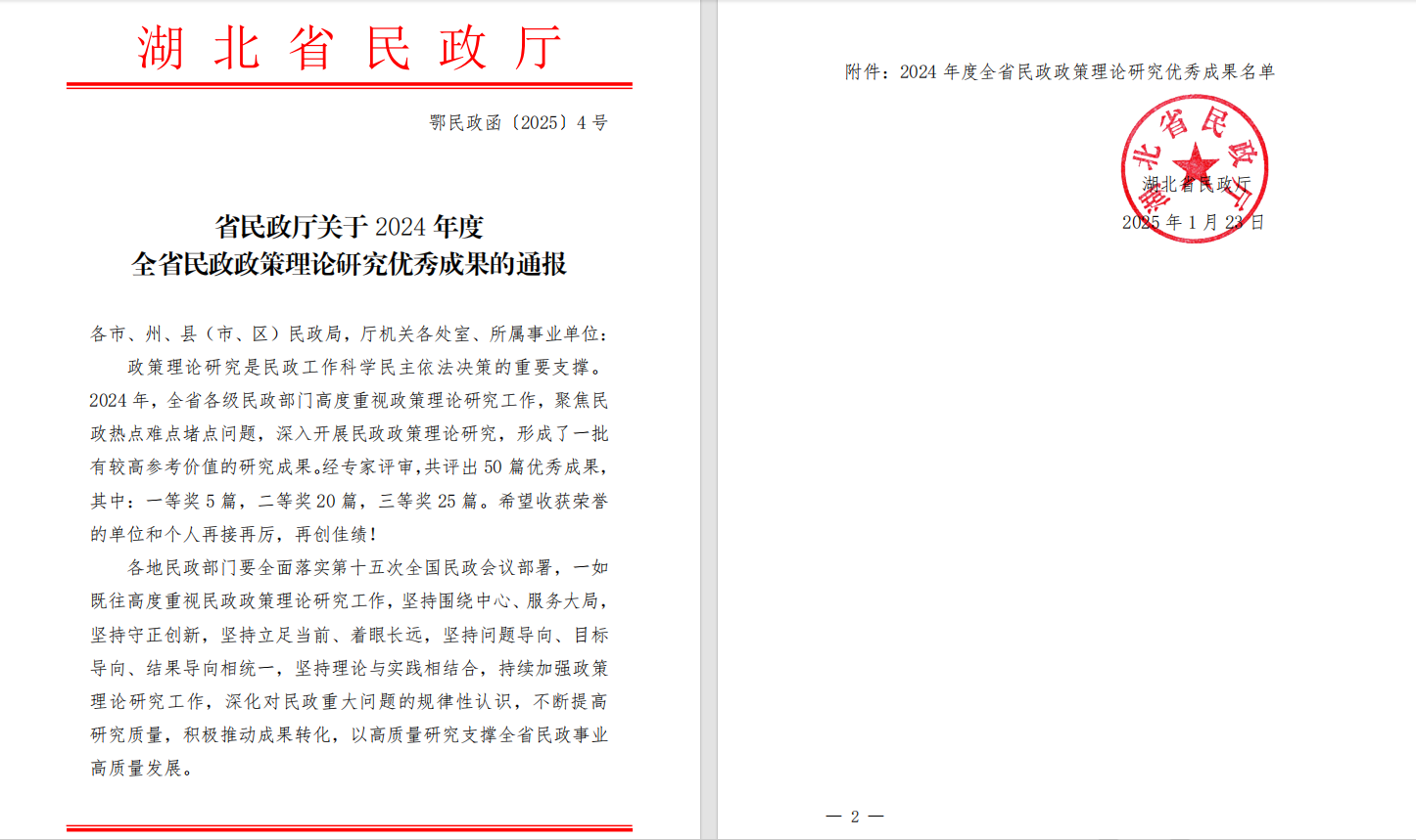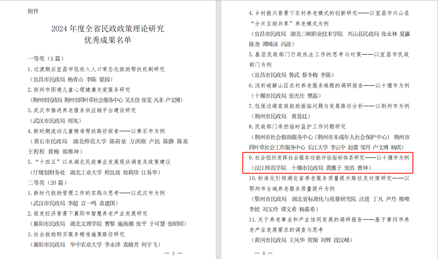 近日,湖北省民政厅公布《关于2024年度全省民政政策理论研究优秀成果的通报》,由威廉体育williamhill行政管理专任教师龚蕙子与十堰市民政局张浩、曹坤联合撰写的《社会组织发挥社会服务功能评估指标体系研究——以十堰市为例》荣获全省民政政策理论研究优秀成果二等奖。