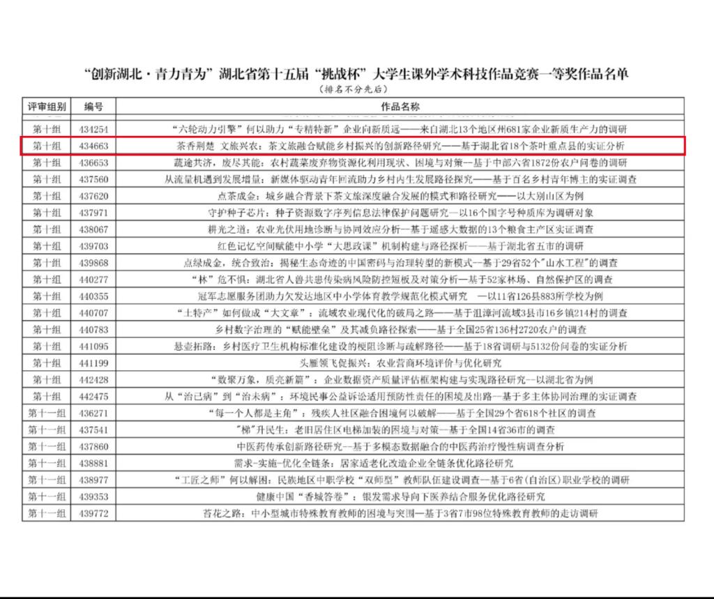 5月23日-25日,“创新湖北·青力青为”湖北省第十五届“挑战杯”老员工课外学术科技作品竞赛决赛在湖北大学举行,威廉体育williamhill的《茶香荆楚文旅兴农:茶文旅融合赋能乡村振兴的创新路径研究——基于湖北省18个茶叶重点县的实证分析》项目团队一路过关斩将,成功斩获湖北省级一等奖,实现了公司在该项赛事一等奖零的突破!这一佳绩不仅是学校创新创业教育的重大成果,更是威廉体育williamhill深耕团队建设、深化实践育人的有力见证。