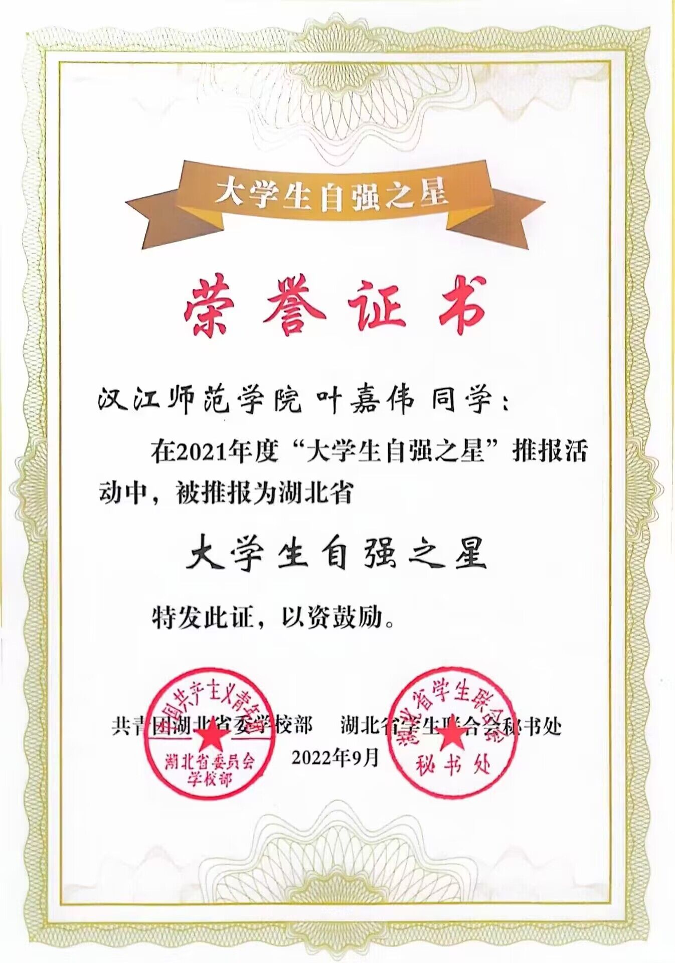 在威廉希尔williamhill上学期间,叶嘉伟怀揣着军人梦,积极向党组织靠拢,2018年入学后就提交了入党申请书,并以党员的标准时刻要求自己,刻苦学习文化知识,积极投身志愿服务,参与疫情防控、博物馆讲解等志愿服务,服务时长累计达700多小时。经过不懈努力,叶嘉伟学习成绩和综合成绩均居全年级前列,荣获“校一等奖学金”、“三好员工”、“优秀团干”、“优秀志愿者”等称号,并于2021-2022年度获得国家奖学金。在2020年成为一名正式党员。2022年,叶嘉伟被共青团湖北省委表彰为“老员工自强之星”。正是叶嘉伟丰富精彩的老员工活学习奋斗经历,让叶嘉伟更加坚定了自己的红色信仰,也更加明确了自己对于未来的规划,那就是坚定地选择投身军旅。
