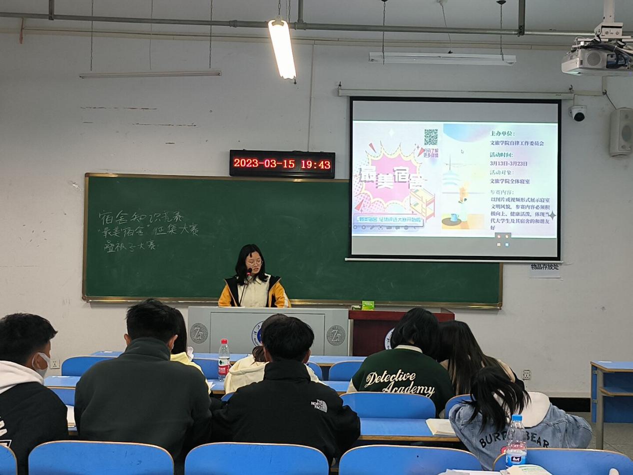 宣讲会上,叶青禾同学介绍了十星级文明宿舍创建的方案、标准和细则,其中十星级分别指思想道德星、遵章守纪星、环境卫生星、学风建设星、安全管理星、团结友爱星、行为管理星、节能环保星、公物管理星和文化建设星。在本次十星级文明宿舍创建中,院自律将开展最美宿舍征集、文明宿舍知识竞赛和宿舍技能叠被子大赛等系列活动。