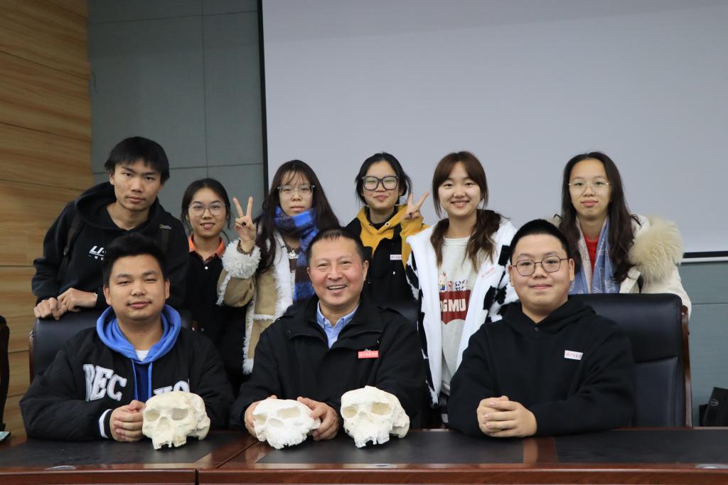 冯教授从他的求学经历入题,生动讲解考古“郧县人”三顶头骨的发现历程、各类石器的出土和多种动物化石的挖掘方式,层层深入。他强调,在古人类学上,郧县人遗址的发现不仅增添了人类化石新材料,而且其形态特征为探讨系统地位的归属和中国远古人类的演化模式提供了重要例证;在当今的历史学研究上,郧县人遗址的发现为进一步发掘带来了全新的考古信息平台,为寻找更多的历史材料和探讨有关学术问题提供了良好的条件。冯教授介绍了下一步郧县人考古工作的具体安排,并为鄂西北地区考古研究发展擘画了全新的蓝图:在保护好历史遗迹的基础上应大力建设考古遗址公园、打造特色文创产品、借用“云上文物”等大数据信息化手段促进文旅融合。最后,同学们积极参与问答,冯教授耐心解答了相关问题,同学们对于遗址考古的热情冯教授深受感动。